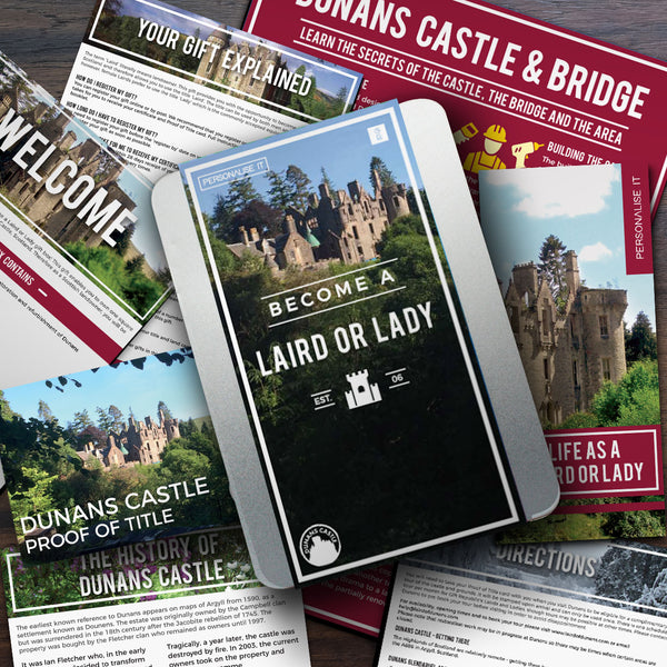 Disclaimer: This is a novelty gift item and must be regarded as such. Anyone is permitted to refer to themselves by any title they wish, including Lord, Lady or Laird, as long as they do not defraud anyone through the use of that title or name. This gift does not entitle the recipient to use a genuine aristocratic title. Once registered, the recipient of this gift will own one square foot of land in the grounds of Dunans Castle, Argyll, Scotland. Although they will be the listed owner of this land by Dunans Castle Ltd, they may not live on the land, make any improvements to, or develop their token plot and the deeds cannot be sold by the owner for a profit. The owner shall not receive any income or derive any other financial benefit whatsoever from their land.. The complimentary Dunans tour is valid for two people and must be booked in advance.
